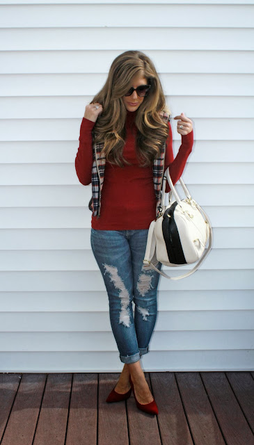 What I'm wearing...jeans: Mossimo (Target), turtle neck: Victoria's Secret, plaid vest: Old Navy, heels: Sam & Libby (Target), bag: Steve Madden, sunnies: Lauren Conrad (Kohl's)